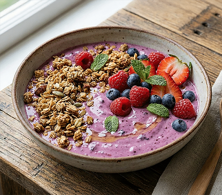Un desayuno completo en formato bowl, espeso, cremoso y naturalmente dulce. Combina frutas, espinaca y yogur griego para aportar fibra y proteína, mientras que el topping crocante suma textura y mayor saciedad, convirtiéndolo en una alternativa más equilibrada que un batido bebible tradicional.