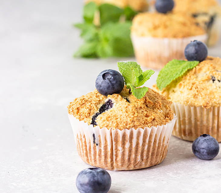 Una opción saludable que reemplaza productos de pastelería tradicionales y resalta la frescura y las propiedades antioxidantes de los frutos rojos. Elaborados con avena integral y coco rallado, estos muffins ofrecen una textura aireada y saciante. Además, los hidratos de carbono de la avena combinados con fibra y proteínas, reducen el índice glucémico vs. versiones originales. El sabor intenso de los arándanos protagoniza esta preparación, convirtiéndola en una opción equilibrada y nutritiva para el cuidado de la salud metabólica.