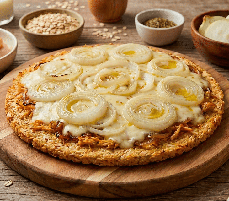 Esta receta revoluciona el concepto tradicional de pizza al sustituir la masa de harina blanca refinada por una base elaborada con pollo y avena, lo que resulta en un plato con alta densidad de proteínas y carbohidratos de absorción lenta. Al eliminar las harinas refinadas, se convierte en una opción estratégica para quienes buscan mantener niveles estables de glucemia y promover la saciedad prolongada. La combinación de cebollas maceradas en vinagre y mozzarella sin sal aporta el sabor característico de la fugazzeta, cuidando la salud cardiovascular y metabólica de manera integral.