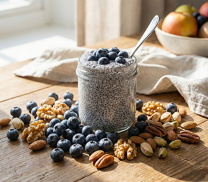 Una propuesta sumamente versátil que aprovecha las propiedades de las semillas de chía para crear una textura cremosa y saciante sin necesidad de cocción. Gracias a su altísimo contenido de fibra soluble, este pudín ayuda a ralentizar la digestión y la absorción de carbohidratos, convirtiéndolo en un aliado estratégico para el control de la glucemia y el tránsito intestinal. Al utilizar yogur natural como base, se enriquece la preparación con proteínas de calidad y probióticos, ofreciendo un desayuno o merienda funcional que protege la salud cardiovascular y digestiva. Además, resulta ideal para combinar con fruta fresca y frutos secos, sumando variedad, textura y un perfil nutricional aún más completo.