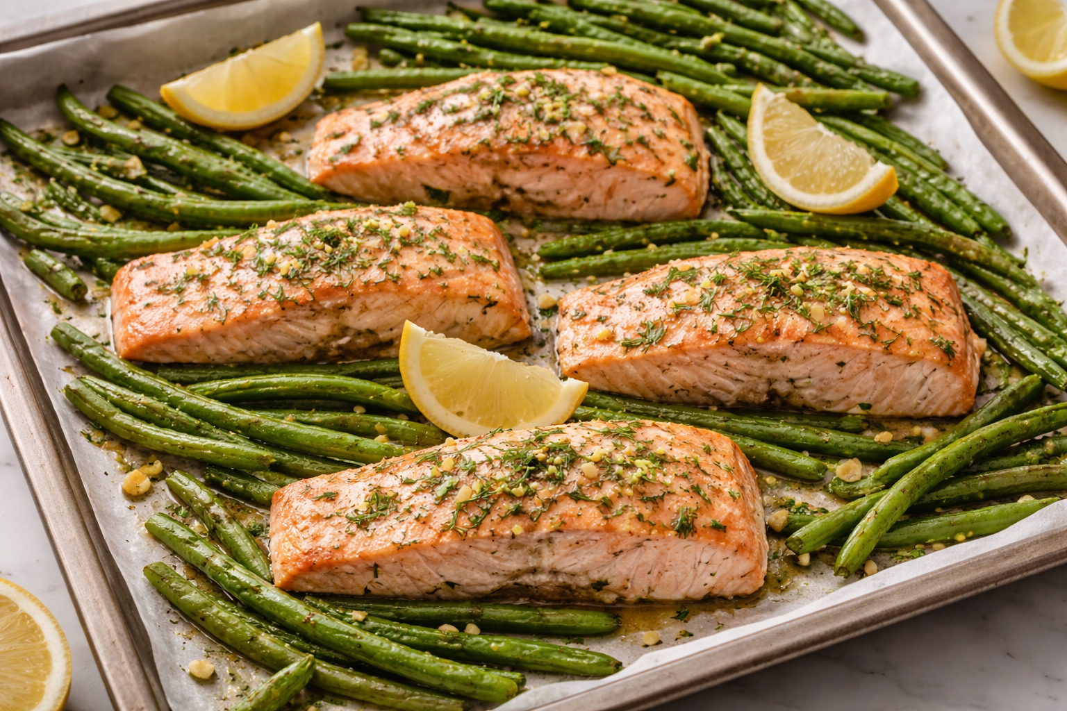 3. Disponé los filetes de salmón y las chauchas en la placa, repartiendo todo de forma pareja.